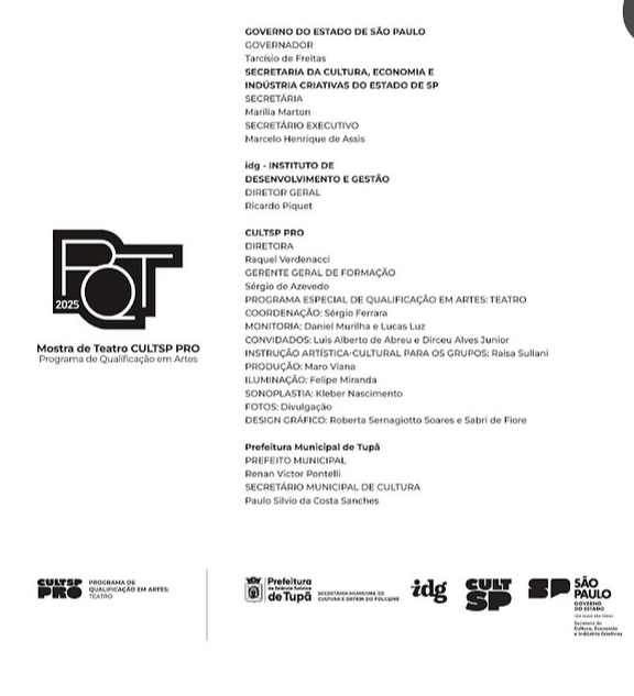 O trabalho de produção cultural para a Mostra Final do PQT foi muito mais do que uma entrega técnica: foi um encontro de almas, uma criação coletiva que nos conduziu à verdadeira fraternidade teatral. Como diz o sábio Sérgio Ferrara, “podemos estar em cargos hoje, mas o teatro é a casa que nunca vão nos tirar.” E foi exatamente essa sensação de casa que vivi ao lado de vocês.